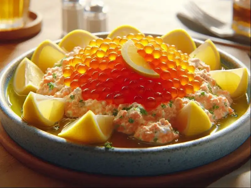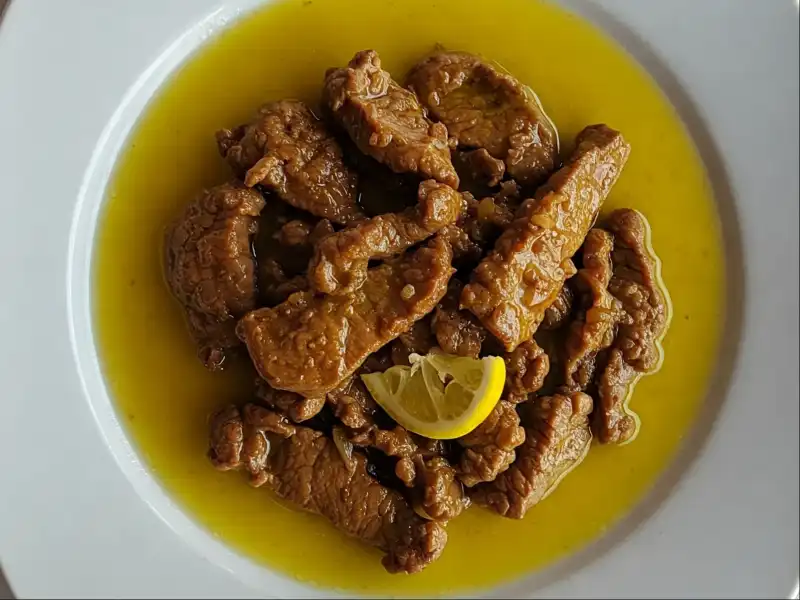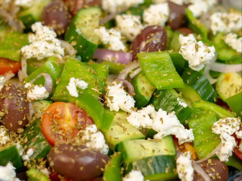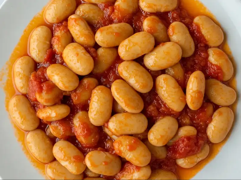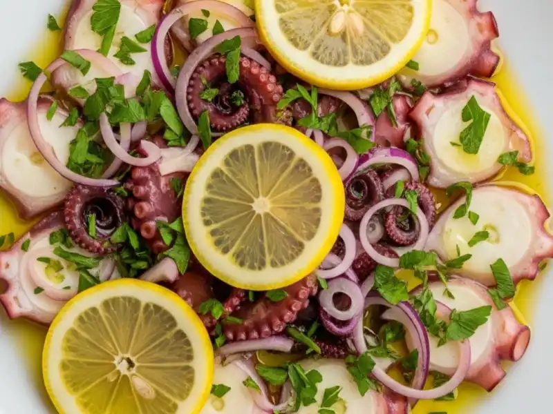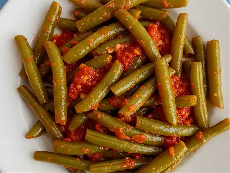 - Fava beans with onion, tomato, capers, olives, and olive oil.